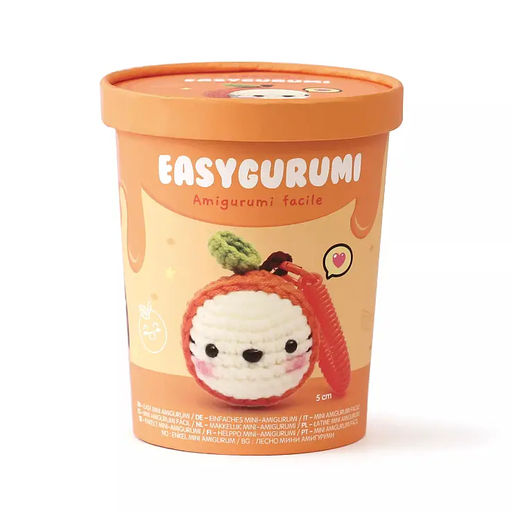 - Il kit amigurumi facile per creare il proprio portachiavi è confezionato in una scatola di cartone illustrata.