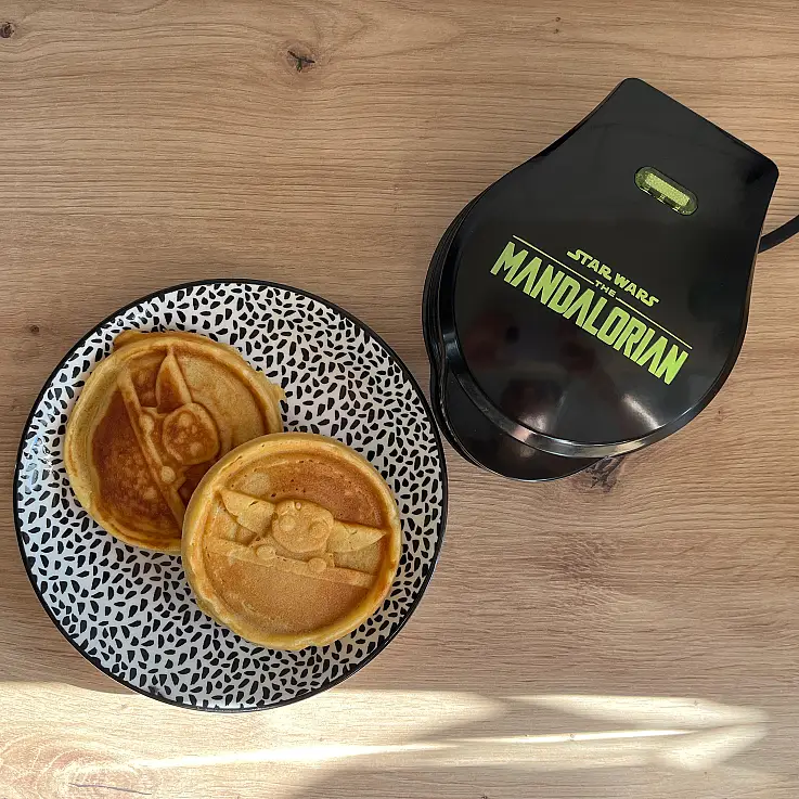 Preparate colazioni di un'altra galassia con questa mini piastra per waffle della serie Star Wars The Mandalorian, i waffle hanno la forma di Baby Yoda!
