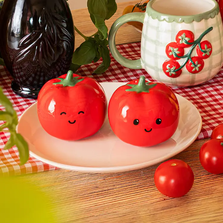 Direttamente dal giardino alla tavola, questo set di saliere e pepiere a forma di pomodoro darà un accento mediterraneo alla vostra tavola.